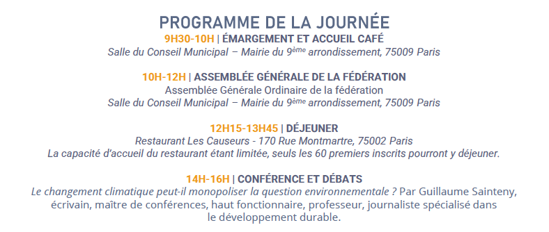 L’Assemblée Générale Ordinaire de la Fédération Patrimoine-Environnement se déroulera le vendredi 17 avril 2026 à la mairie du 9ème arrondissement à Paris et sera suivie d’une conférence l’après-midi.